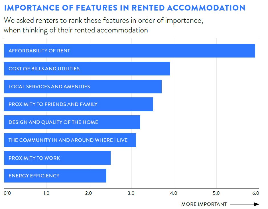 - Other factors like proximity to work, community and, design and quality of the home fall in between in terms of importance, indicating a mix of considerations when choosing rented accommodation.