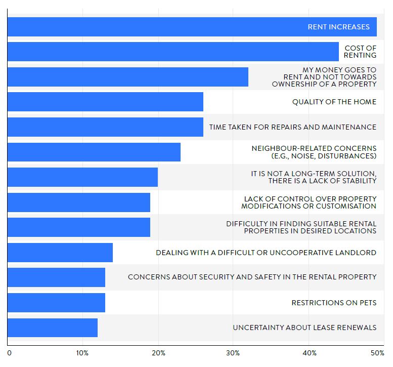 - Concerns about "lack of control over property modifications or customisations," "difficulty in finding suitable rental properties in desired locations," and "dealing with a difficult or uncooperative landlord" are also notable concerns.