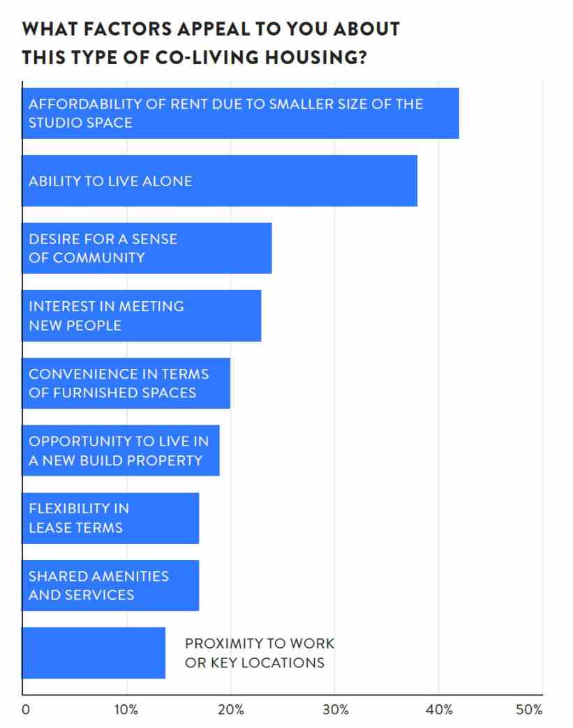 - Interestingly, the second top answer was for the “ability to live alone” (38%). For many respondents the appeal of leaving a house share to gain some privacy via their own living space whilst sharing common spaces with their neighbours, is appealing.