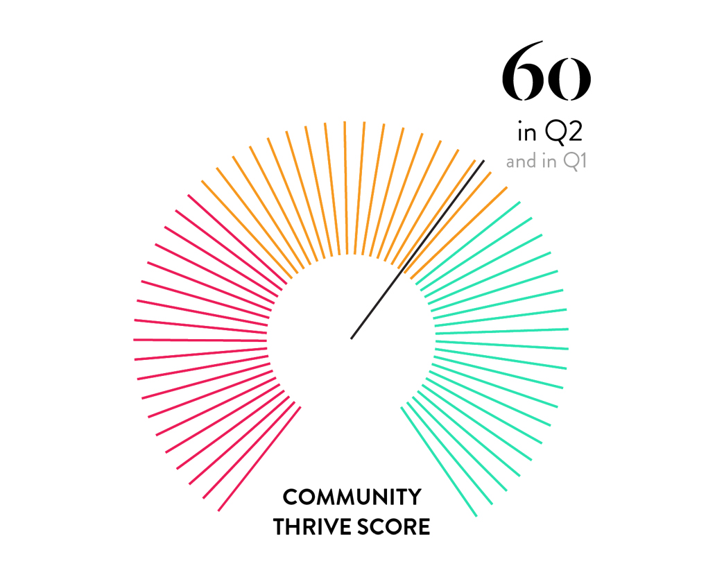 Our Thrive Scores are a simple yet straight to the heart of the matter insight into how we feel we are faring as individuals and how we reflect on our communities as a whole.