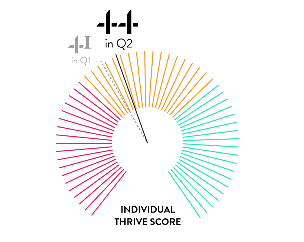 The good news is that the dial has moved in the right direction since Survey 1, with our individual Thrive Score up three points from 41 to 44. This represents a drop in the number of us saying we are rarely or never thriving from 45% to 37%, but there is still a lot of room for improvement as only 20% of us say we are thriving a majority of the time.